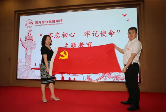 活动最后,由大河教育董事长张慧、美和众邦集团总裁王洪涛进行党旗传递仪式。