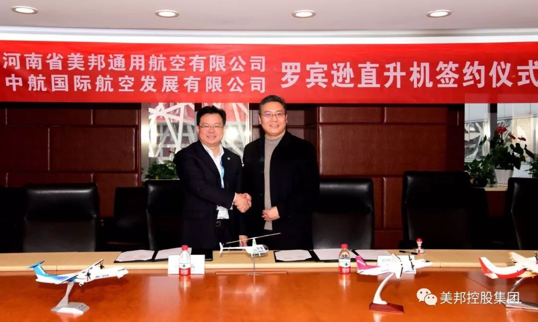 2018年2月1日上午10点,美邦通航与中航国际直升机签约仪式在中航国际总部隆重举行。河南省美邦通用航空有限公司董事长孙大帅、中航国际副总裁/通航发展部总经理吴小华、中航国际通航发展部销售部部长高海峰、中航国际通航发展部销售部区域市场总监马靖寰共同参加了此次仪式。