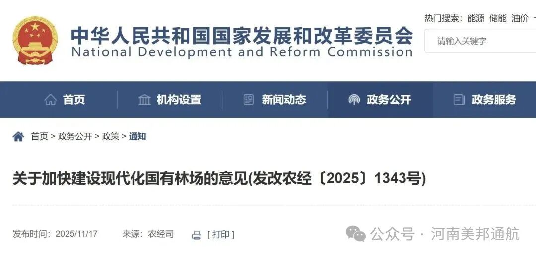11月17日,为进一步巩固国有林场改革成果,加快建设现代化国有林场,国家发展改革委、财政部、人力资源社会保障部、自然资源部、交通运输部、国家林草局近日联合印发《关于加快建设现代化国有林场的意见》(以下简称《意见》)。《意见》明确,提高生态保护管理能力,打造人防、技防、物防相结合的资源管护体系,加快推动“天空地”一体化监测、无人机、以水灭火、航空护林、大型装备等现代化、信息化装备在国有林场的普及,推动建设“固定站点+移动站点”智慧管护体系,全面提升林场资源管理、森林草原防火、有害生物综合防控和野生动植物保护能力。鼓励国有林场培育和发展林草产业新质生产力,推动物联网、大数据、人工智能等新技术及低空经济等领域新场景的应用。